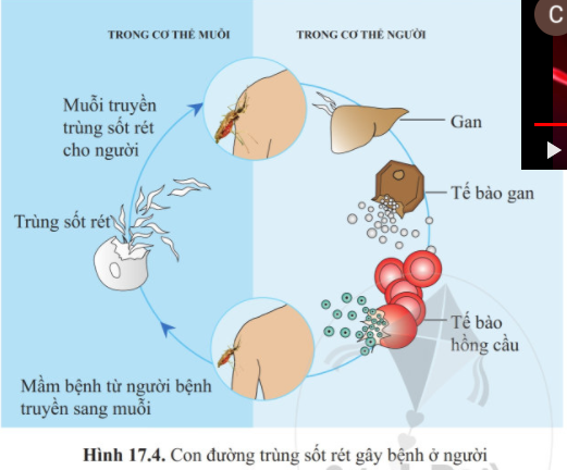 + Trùng sốt rét: Muỗi truyền trùng sốt rét vào người. Trùng theo máu đến gan, kí sinh trong tế bàp hồng cầu, phá vỡ các tế bào hồng cầu gây sốt rét.