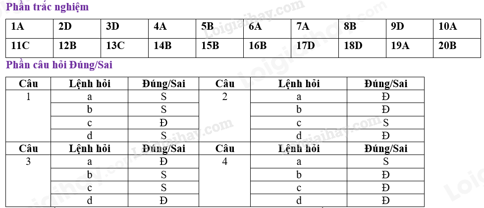 Thí sinh trả lời từ câu 1 đến câu 4. Trong mỗi ý a, b, c, d ở mỗi câu, thí sinh chọn đúng hoặc sai