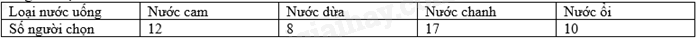 Câu 15: Một cửa hàng bán nước hoa quả đã khảo sát về loại nước mà khách hàng ưu chuộng và thu được bảng dữ liệu sau: