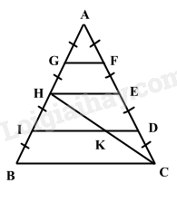 Xét tam giác ABC có: \(\frac{{AI}}{{IB}} = \frac{{AD}}{{DC}}\left( {AG + GH + HI = AF + FE + ED} \right) \Rightarrow ID//BC\) (định lí Thales đảo)