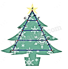 Để làm cây thông noel, người thợ sẽ dùng một cái khung sắt hình tam giác cân như hình vẽ bên, sau đó gắn mô hình cây thông lên. Cho biết thanh BC = 120cm. Tính độ dài các thanh GF; HE; ID.