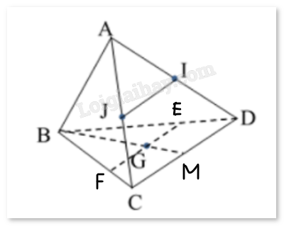 Vì \(\left\{ {\begin{array}{*{20}{c}}{EF = (IJG) \cap (BCD)}\\\begin{array}{l}G \in (IJG)\\G \in (BCD)\end{array}\end{array}} \right.\) nên E, G, F thẳng hàng.