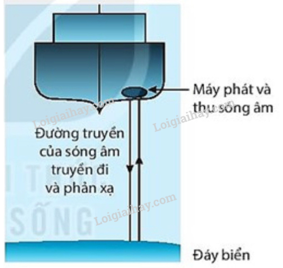 Câu 10: Người ta ứng dụng hiện tượng phản xạ sóng âm để đo độ sâu của biển. Sóng âm có tần số cao (siêu âm) từ con tàu trên mặt biển phát ra truyền tới đáy biển (Hình vẽ). Tại đó sóng âm bị phản xạ trở lại và được một thiết bị trên tàu ghi lại. Trong một phép đo độ sâu của đáy biển người ta ghi lại được từ lúc phát ra siêu âm đến khi nhận được âm phản xạ là 1,2 s. Biết tốc độ truyền âm trong nước biển là 1 500 m/s. Tính độ sâu của đáy biển.