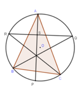 Tương tự ta có $sđ\overparen{AQ} = sđ\overparen{CQ}=\dfrac{1}{2}sđ\,\overparen{AC} $$sđ\overparen{AR} = sđ\overparen{BR}=\dfrac{1}{2}sđ\,\overparen{AB} .$ Khi đó theo tính chất của góc có đỉnh bên trong đường tròn ta có