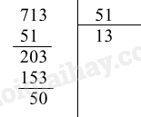 Thương \(q\) và số dư \(r\) trong phép chia \(a = 713\) cho \(b = 51\) là q = 13; r = 50 nên 3 – e.