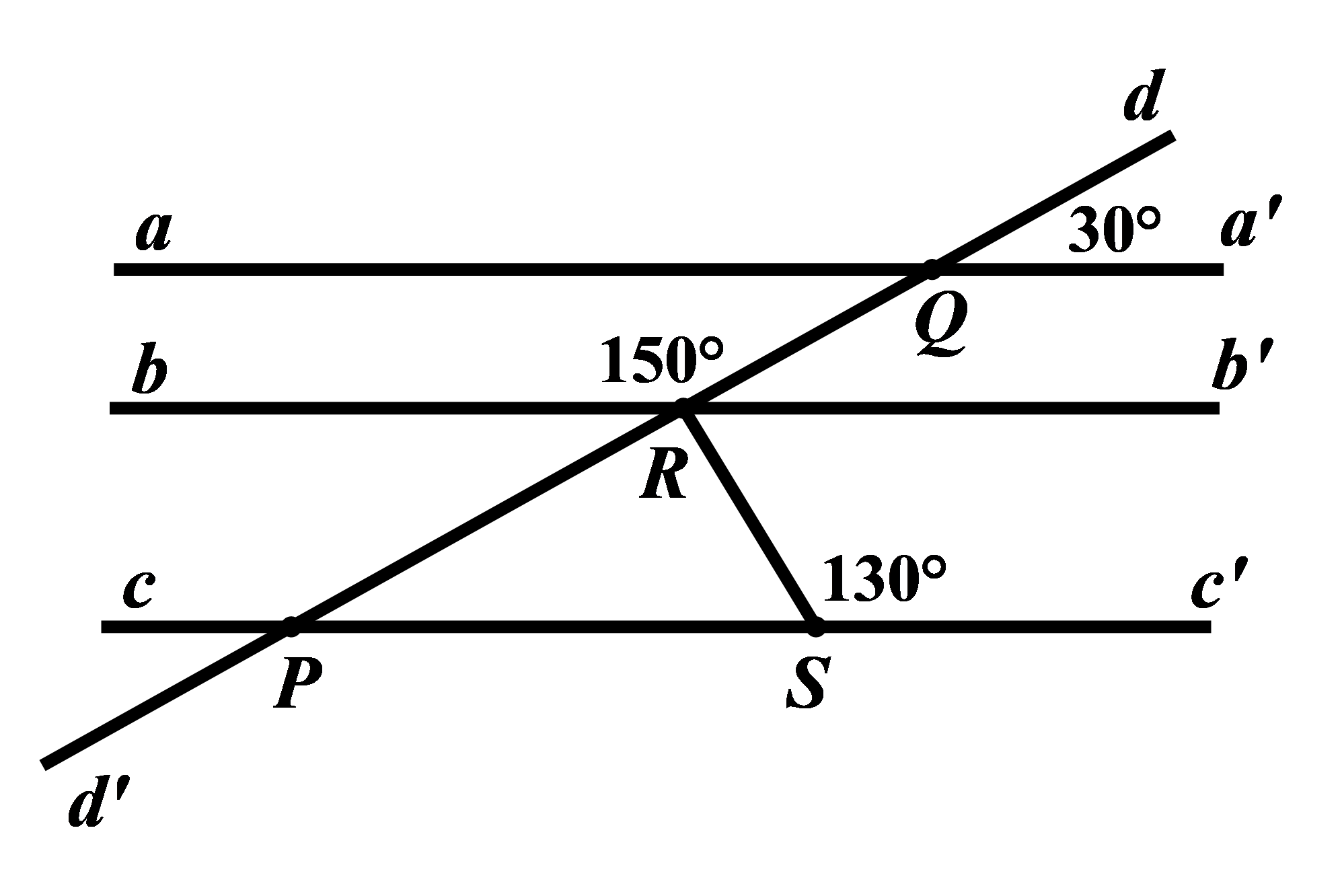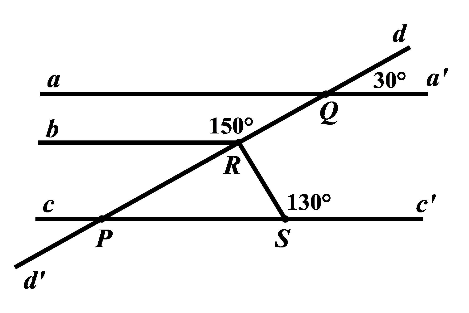 Do \(aa'//bb'\) nên \(\angle dPc' = \angle dQa' = {30^0}\) (hai góc đồng vị). Vì vậy \(\angle dPc' = \angle QRb'\) (cùng bằng \({30^0}\)).