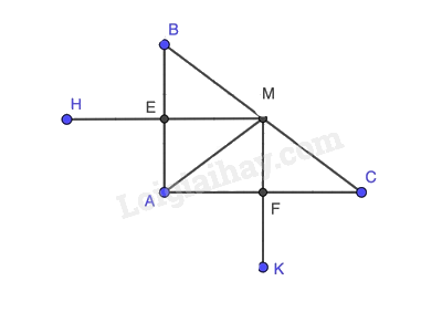 Bài 3. (2,5 điểm) Cho tam giác \(ABC\) vuông tại A, đường trung tuyến \(AM\). Gọi \(H\) là điểm đối xứng với \(M\) qua \(AB\), \(E\) là giao điểm của \(MH\) và \(AB\). Gọi \(K\) là điểm đối xứng với \(M\) qua \(AC\), \(F\) là giao điểm của \(MK\) và \(AC\).