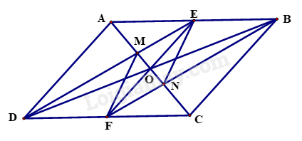 Vì DEBF là hình bình hành nên BD và EF cắt nhau tại trung điểm của mỗi đường. Vì O là trung điểm của BD nên O cùng là trung điểm của EF. Khi đó BD và EF cắt nhau tại O. (2)