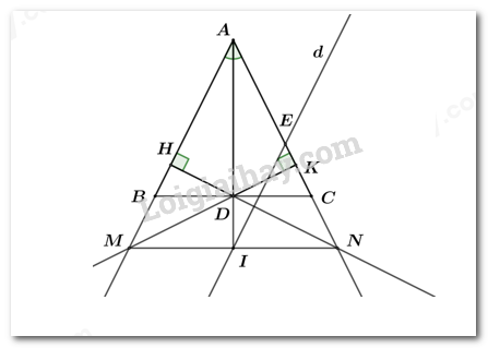 b) Tia \(KD\)cắt tia \(AB\)tại \(M\), tia \(HD\)cắt tia \(AC\)tại \(N\). Chứng minh: \(HM = KN\)