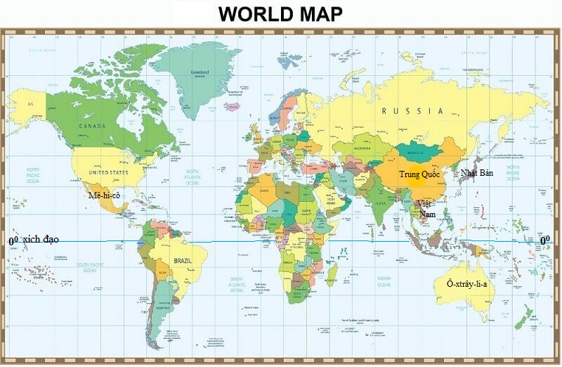 - Nước ta có vị trí thuộc bán cầu Bắc. Các quốc gia cũng có vị trí địa lí nằm ở bán cầu Bắc cùng với nước ta là Nhật Bản, Ấn Độ, Mê-hi-cô (có vị trí ở phía bắc đường xích đạo) nên có thời kì diễn ra mùa nóng, lạnh giống nhau.
