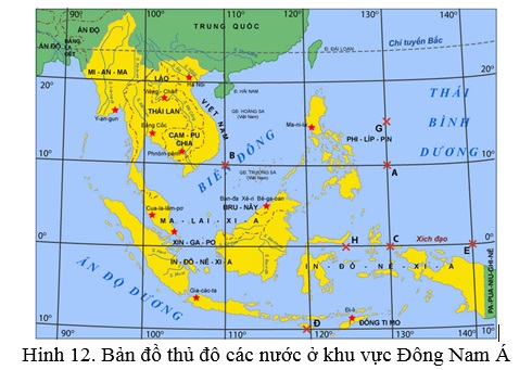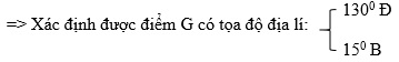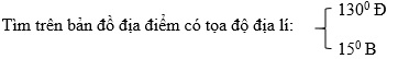 Dựa vào mạng lưới kinh, vĩ tuyến trên bản đồ -> tìm ra các đường kinh tuyến 1300 Đ và vĩ tuyến 150 B. Điểm cắt nhau của hai đường kinh, vĩ tuyến này chính là tọa độ địa lí của điểm đó.