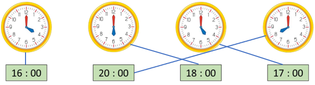Câu 8. Nối hai đồng hồ chỉ cùng thời gian vào buổi chiều hoặc buổi tối: