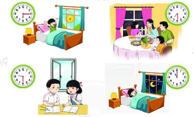 Câu 3. Xem giờ trên mỗi đồng hồ rồi điền thời gian thích hợp cho mỗi hoạt động: