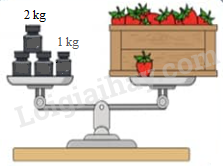 Thùng dâu tây có cân nặng bằng cân nặng của 3 quả cân 2kg và 1 quả cân 1 kg.