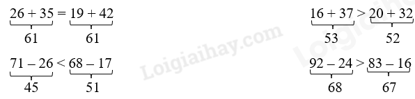 Tính kết quả phép tính ở hai vế rồi điền dấu thích hợp.