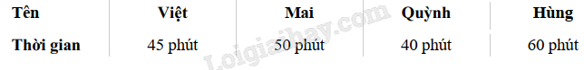 Dãy số liệu thống kê về thời gian đọc sách của các bạn theo thứ tự từ nhiều nhất đến ít nhất là: 60 phút, 50 phút, 45 phút, 40 phút.