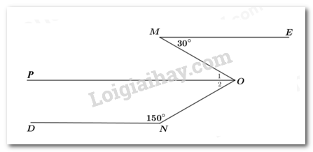Cho hình vẽ dưới, biết số đo các góc \(\widehat {EMO} = 30^\circ \), \(\widehat {DNO} = 150^\circ \), \(\widehat {MON} = 60^\circ \). Chứng minh \(ME//DN\).