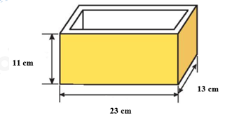 Một khuôn đúc bê tông có kích thước như hình vẽ. Bề dày các mặt bên của khuôn là \(1,2\,cm.\) Bề dày mặt đáy của khuôn là \(1,9\,cm.\) Thể tích của khối bê tông được khuôn này đúc ra là bao nhiêu xăngtimét khối?