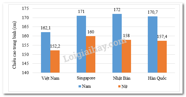 Câu 8: Cho biểu đồ biểu diễn chiều cao trung bình của nam và nữ ở một số quốc gia châu Á:
