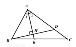 Cho tam giác \(ABC\) có \(AB < AC\). Tia phân giác của góc \(A\) cắt \(BC\) ở \(K\). Từ \(B\) kẻ đường vuông góc với \(AK\) tại \(H\) cắt \(AC\) ở \(D\). Chọn câu sai.