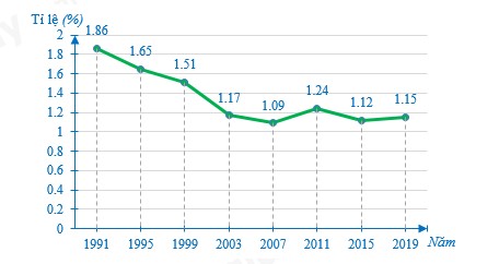 Câu 10: Cho biểu đồ thể hiện tỉ lệ gia tăng dân số Việt Nam từ năm 1991 đến năm 2019 như dưới đây: