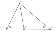 Câu 9: Tam giác MNP có \(\angle M = {60^0}\), \(\angle N = {20^0}\), NK là tia phân giác. Số đo của góc \(\widehat {NKP}\) bằng: