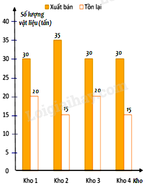 Một công ty kinh doanh vật liệu xây dựng có bốn kho hàng có 50 tấn hàng. Kế toán của công ty lập biểu đồ cột kép ở hình bên biểu diễn số lượng vật liệu đã xuất bán và số lượng vật liệu còn tồn lại trong mỗi kho sau tuần lễ kinh doanh đầu tiên.