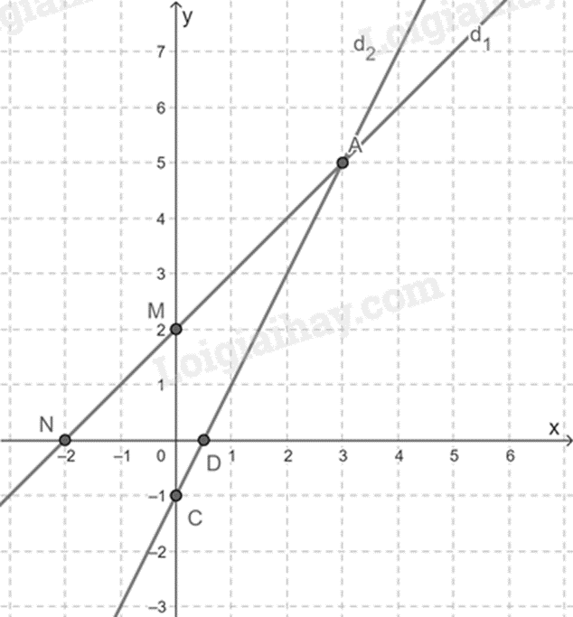 Cho hai đường thẳng \({d_1}:y = 2x - 1;\,\,\,\,\,\,\,{d_2}:\,y = x + 2\) .