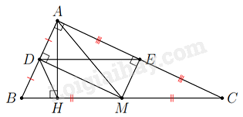 \(\widehat D = \widehat E = {90^0}\) (\(MD\) vuông góc với \(AB\) tại \(D\), \(ME\) vuông góc với \(AC\) tại \(E\))