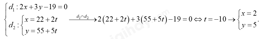 Câu 14: Cho hai đường thẳng \(\;{d_1}:2x + 3y - 19 = 0\) và \(\;{d_2}:\left\{ {\begin{array}{*{20}{c}}{x = 22 + 2t}\\{y = 55 + 5t}\end{array}} \right.\). Tìm toạ độ giao điểm của hai đường thẳng đã cho.