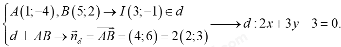 Câu 11: Đường trung trực của đoạn \(AB\) với \(A\left( {1; - 4} \right)\) và \(B\left( {5;2} \right)\) có phương trình là: