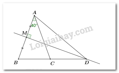 Tam giác ABC cân tại A nên \(\angle MBD = \angle ACB = \dfrac{{{{180}^0} - \angle BAC}}{2} = \dfrac{{{{180}^0} - {{40}^0}}}{2} = {70^0}\)