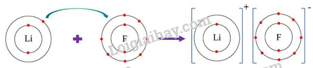 Nguyên tử Li cho 1 electron lớp ngoài cùng để thành ion dương Li+, nguyên tử fluoride nhận 1 electron từ lithium để có 8 electron lớp ngoài cùng