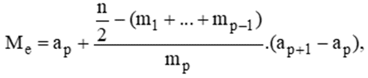 trong đó n là cỡ mẫu, mp là tần số nhóm p. Với p = 1, ta quy ước m1 + ….+ mp-1 = 0.