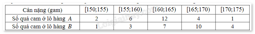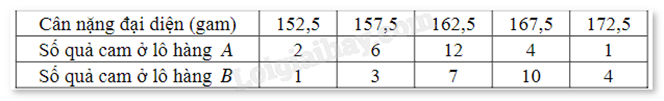 Kết quả khảo sát cân nặng của 25 quả cam ở mỗi lô hàng A, B được cho ở bảng sau:
