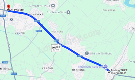 Một người sử dụng google map để tra đường đi từ Trường THPT Quế võ số 2 đến ngã tư Phố mới thuộc thành phố Bắc Ninh được kết quả như hình vẽ bên dưới. Để đúng như bản đồ gợi ý, quãng đường dài 5,7 km, thời gian đi là 8 phút thì người đó phải di với tốc độ trung bình bằng