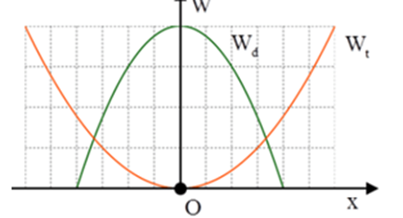 c) \({W_d} = {W_t} \Rightarrow {A^2} - {x^2} = {x^2} \Rightarrow {x^2} = \frac{{{A^2}}}{2} \Rightarrow x = \pm \frac{{A\sqrt 2 }}{2}\)