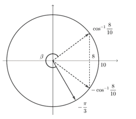 \[t = 8T - \frac{\beta }{\omega } = 8.\frac{{2\pi }}{{3\pi }} - \frac{{2\pi - \left( {{{\cos }^{ - 1}}\left( {0,8} \right) + \frac{\pi }{3}} \right)}}{{3\pi }} \approx 4,85{\rm{ s}}\]