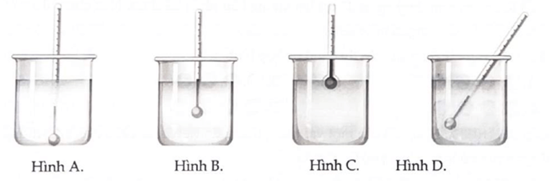 Hình vẽ dưới đây gồm bốn cách sắp xếp để đo nhiệt độ của nước trong cốc bằng nhiệt kế trong phòng thí nghiệm. Hình vẽ nào thể hiện sự sắp xếp đúng để đo nhiệt độ chính xác?