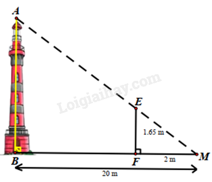 Trong hình bên, biết MB = 20m, MF = 2m, EF = 1,65m. Tính chiều cao AB của ngọn hải đăng.
