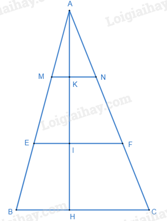 Cho tam giác ABC có BC = 20cm. Trên đường cao AH lấy các điểm K, I sao cho AK = KI = IH. Qua I và K kẻ các đường EF và MN song song với BC (E, M \( \in \) AB, F, N \( \in \) AC).