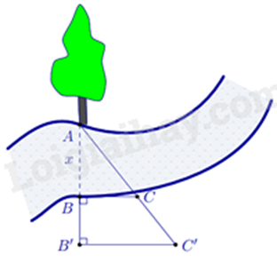 Người ta tiến hành đo đạc các yếu tố cần thiết để tính chiều rộng của một khúc sông mà không cần phải sang bờ bên kia sông (hình vẽ bên). Biết \(BB' = 20\)m, \(BC = 30\)m và \(B'C' = 40\)m. Tính độ rộng \(x\) của khúc sông.