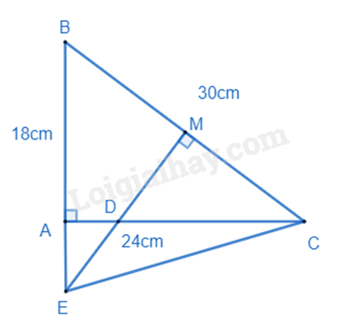 Cho \(\Delta ABC\) có AB = 18cm, AC = 24cm, BC = 30cm. Gọi M là trung điểm của BC. Qua M kẻ đường thẳng vuông góc với BC cắt AC, AB lần lượt tại D, E.