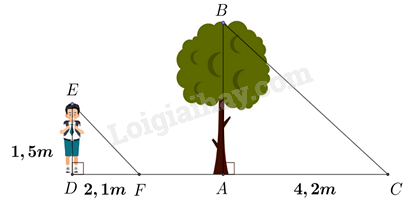 Một người cao 1,5 mét có bóng trên mặt đất dài 2,1 mét. Cùng lúc ấy, một cái cây gần đó có bóng trên mặt đất dài 4,2 mét. Tính chiều cao của cây.