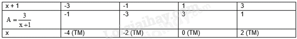 c) Để A nhận giá trị nguyên thì \(3 \vdots \left( {x + 1} \right)\) hay \(x + 1 \in U\left( 3 \right)\). \(U\left( 3 \right) = \left\{ { \pm 1; \pm 3} \right\}\). Ta có bảng giá trị sau: