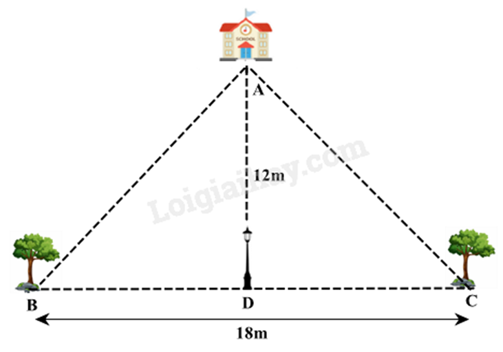 Hai cây B và C được trồng dọc trên đường, cách nhau 18m và cách đều cột đèn D. Ngôi trường A cách cột đèn D 12m theo hướng vuông góc với đường (xem hình vẽ). Tính khoảng cách từ mỗi cây đến ngôi trường.