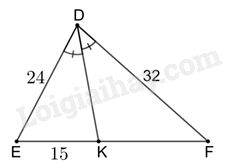 Ta có DK là tia phân giác của góc EDF nên \(\frac{{DE}}{{EK}} = \frac{{DF}}{{KF}} \Rightarrow KF = DF:\frac{{DE}}{{EK}} = 32:\frac{{24}}{{15}} = 20\).