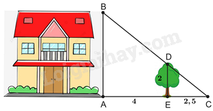 Để tính chiều cao AB của ngôi nhà (như hình vẽ), người ta đo chiều cao của cái cây ED = 2m và biết được các khoảng cách AE = 4m, EC = 2,5m.