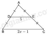 \(\begin{array}{l} \Rightarrow DE = \frac{1}{2}\left( {2x - 1} \right)\\5 = x - \frac{1}{2}\\x = 5,5\end{array}\)