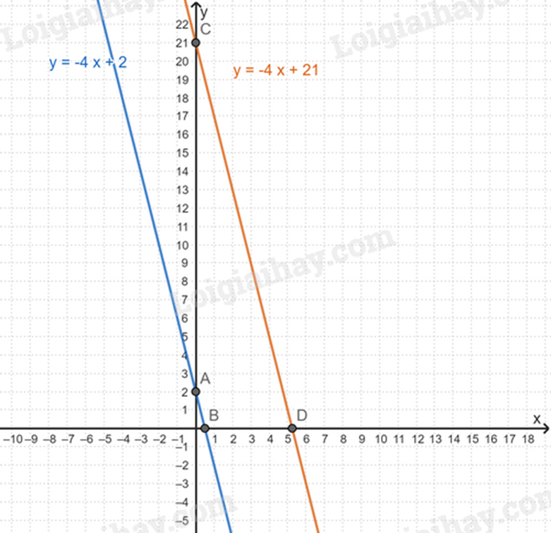 + Cho y = 0 thì 0 = -4x + 21 => x =\(\frac{{21}}{4}\). Ta được điểm \(D\left( {\frac{{21}}{4};0} \right)\).